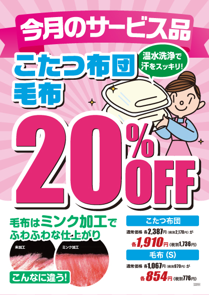 クリーニングポケットでは、10月限定で「毛布・こたつ布団」クリーニングを20%OFFにて承ります。